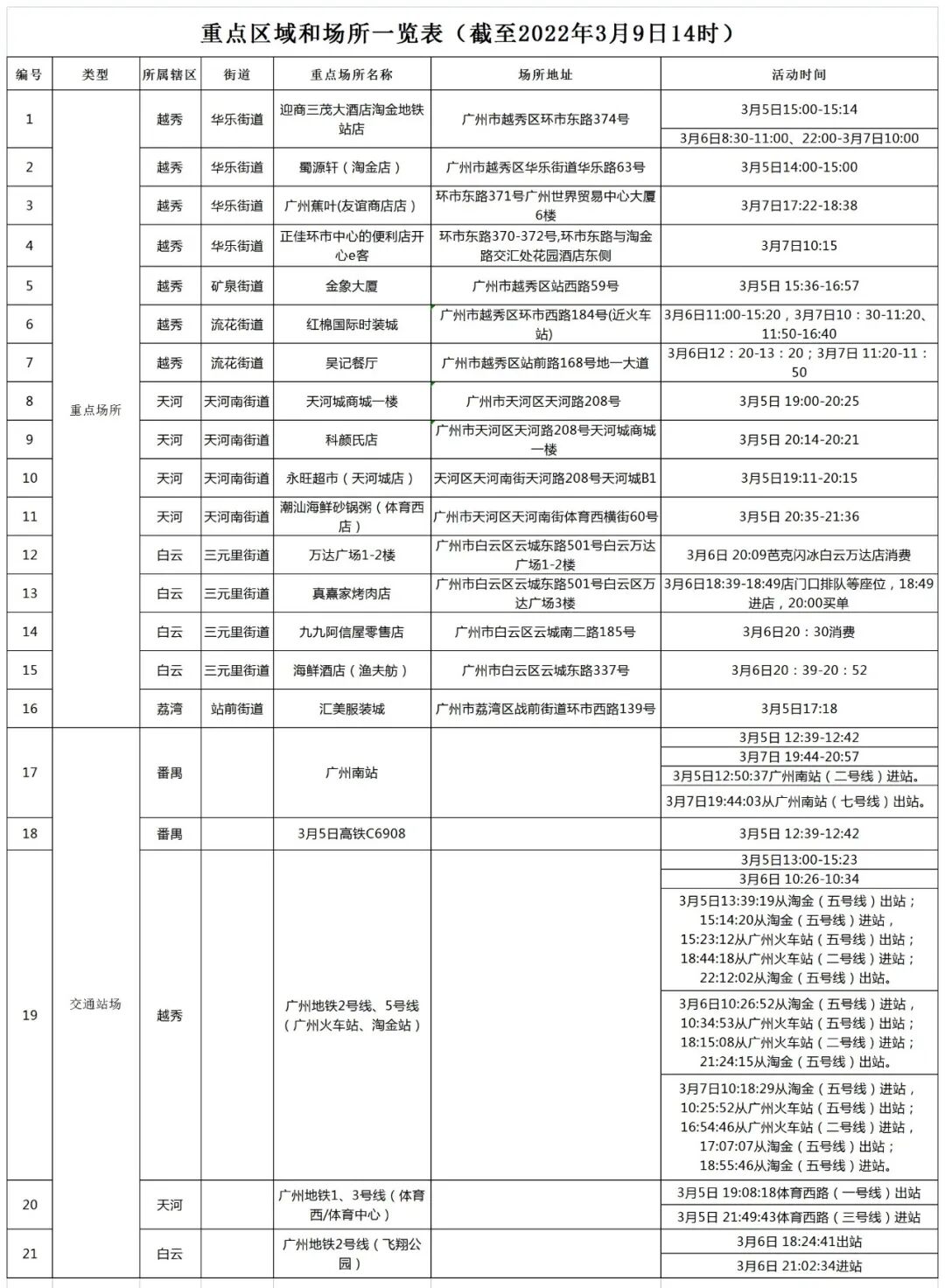 因阳江市江城区一例确诊新冠病毒感染患者于2022年3月5日至7日期间,在广州市活动,具体活动轨迹如下: